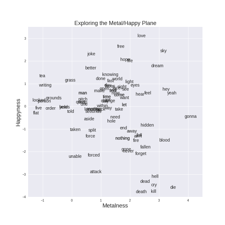 But there’s more, lots more. “For the 6000 words which appear in both our score for “Metalness” and the Hedonometer dataset, we have can place the word at a point the in the two-dimensional “Happy/Metal” Plane. A sample of these words are plotted below.”